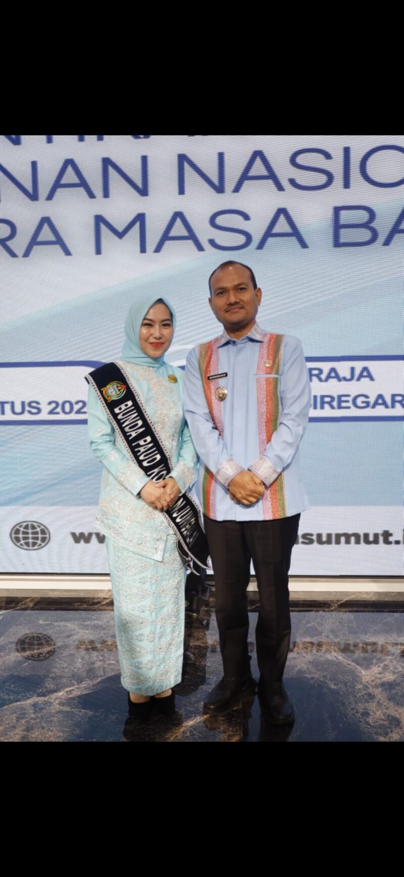 Medan, Diskominfo – Wali Kota Tanjungbalai, Mahyaruddin Salim mendampingi sekaligus menghadiri pengukuhan Ny. Mashandayani Mahyaruddin sebagai Bunda Pendidikan Anak Usia Dini (PAUD) masa bakti 2025-2030 bersama 33 Bunda PAUD Kab/Kota Se Provinsi Sumatera Utara, Rabu (13/8/2025) bertempat di Aula Raja Inal Siregar